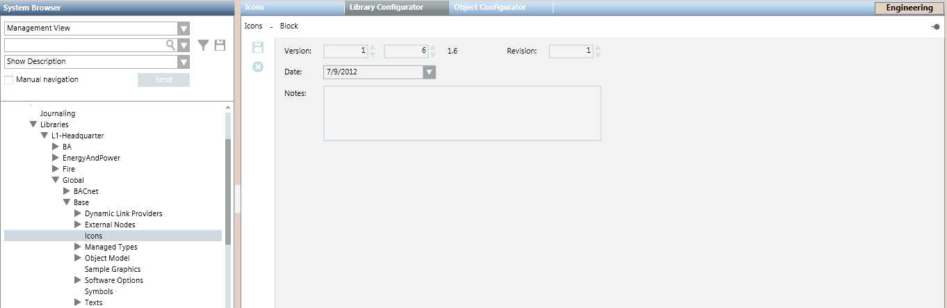 Selecting a library block (for example, Icons) causes the Library Configurator tab to display the version information of the block. From here, authorized experts can update this information if needed, or delete the block altogether.