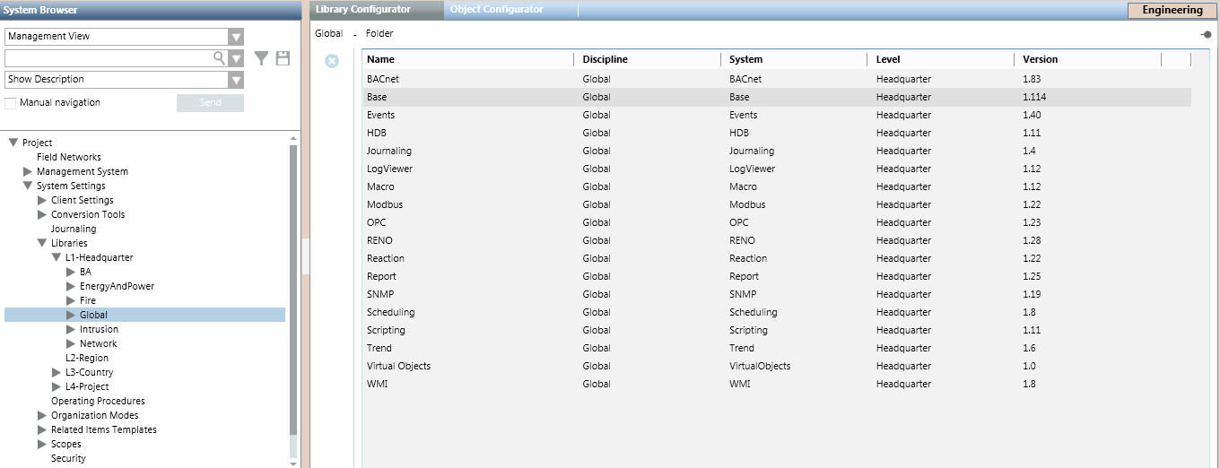 Selecting a folder (for example, Global) causes the Library Configurator to display a list of all the libraries located under that folder.