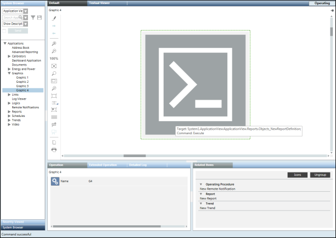 1. In System Browser, expand the Reports folder and drag the report definition to be executed to the window labeled Untitled in the Graphics editor.