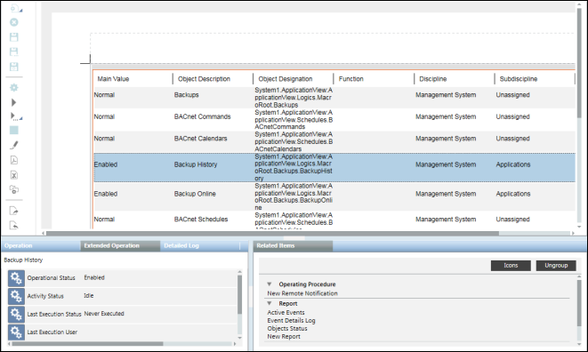 • The information of the object or objects in the selected row or rows displays in the Extended Operation tab.
