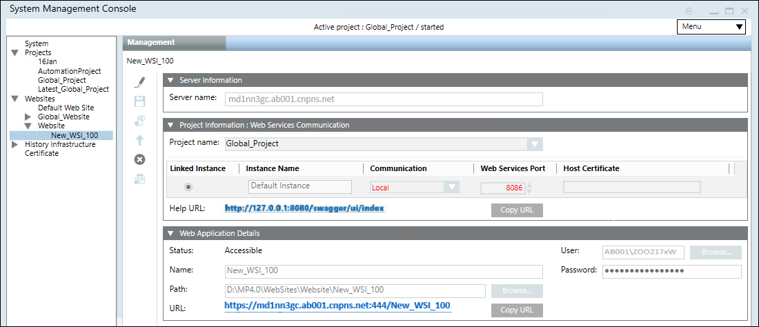 The data is validated on successful creation. NOTE: Any inconsistency with the Web Services URL, for example, if you have configured the Web Services URL which is not reachable or the Web Services URL is deleted, then the Web Service URL displays in red. You must click Editand configure the working Web Services URL. Additionally, you also must ensure that the parent website is started.