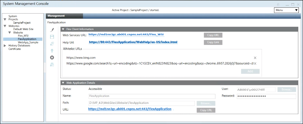 (Optional) In the Whitelist URLs section of the Flex Client Information expander, do the following to whitelist an URL: a. Click Add. b. Enter a URL that you want to whitelist in the textbox. You can also add multiple URLs for whitelisting. To delete an already whitelisted URL, select it and click . NOTE: Only secured (https) URLs can be added for whitelisting.