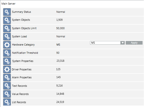 The Extended Operation tab displays the various properties of the Main Server object, which also include those relating to the hardware category and system limits.