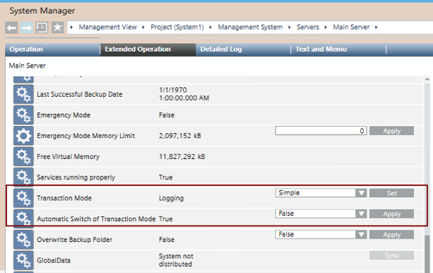 The Transaction Mode is a property of the Main Server. It sets how data is written to the project database. Its value during normal operation is Logging. It may need to be switched to Simple to speed up certain configuration import tasks. This switch can be performed manually, or you can set the system to always switch the Transaction Mode automatically (recommended).
