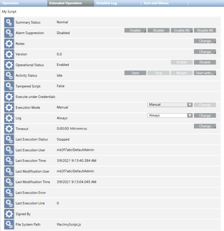 When you select a script object in System Browser, its properties and commands display in the Extended Operation tab.