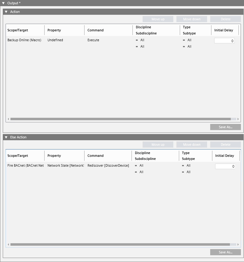 Inside the Action or Else Action expander, you specify the output instructions you want to execute. Each instruction occupies one row and defines a command that will be issued when that instruction is executed.