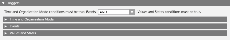 - Select AND to obtain: Time&Organization Mode AND Events AND Values & States: all three triggers must be asserted (true) for the reaction to start.