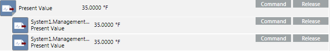 If you select multiple objects of the same type, for example, Analog Output, the icon next to the property name indicates this with a triangular symbol in the lower-right-hand corner. Clicking this symbol expands the table row to show all of the selected objects of the same type that share this property. You can then change (command) all Present Value properties for the selected objects at the same time. You can command a maximum of 250 objects.