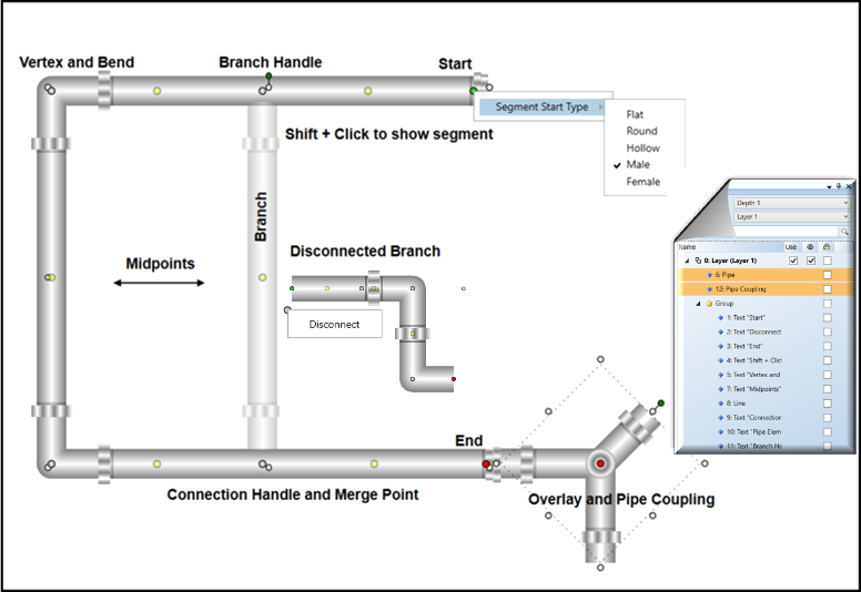 When you draw a pipe coupling element on the canvas, select from one of five connector types by clicking on the red selector button when the element is selected. Used in conjunction with the element rotation handles and the Layout properties (Flip X and Flip Y) all positions are achievable.
