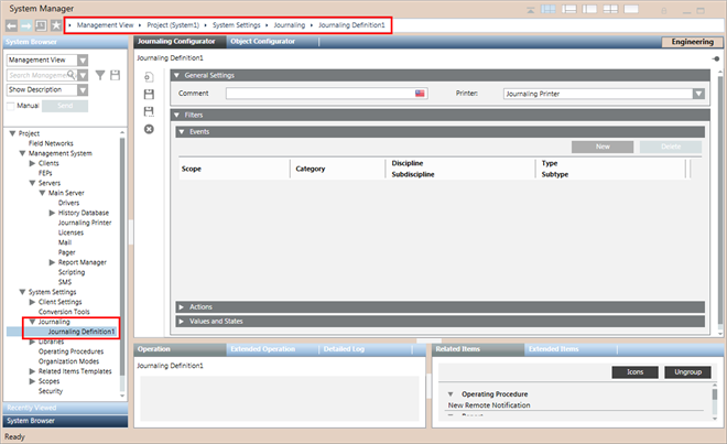 In Engineering mode, when you select a journaling definition in System Browser, the Journaling Configurator tab lets you configure the journaling definition by allowing you to select a journaling printer from the Printer drop-down list. It also lets you set items to be included in the printout using one or more filters (Events, Actions, Values and States).
