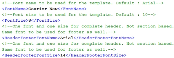 - To set the font name and size for the header and footer: enter the font name and size within the <HeaderFooterFontName> and <HeaderFooterFontSize> tags.