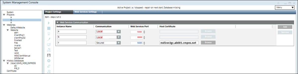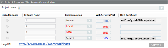 Once the WSI extension is added to the project, during the project modification you can configure the Web Services Settings for multiple WSI instances, including the instance name, the type of communication, web services port, and the host certificate.
