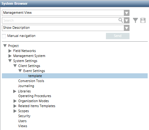 Event settings rules are located under Project > System Settings > Client Settings > Event Settings in the Management View of System Browser.