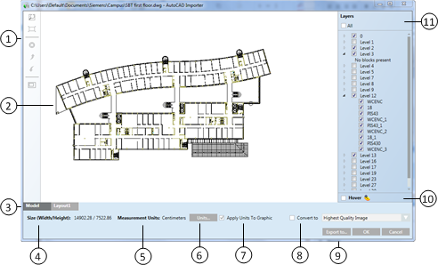 11 | Layers Allows you to select the layers and blocks to be included in the import of the drawing. |