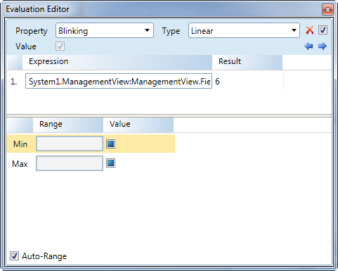Range | Display the minimum and maximum range applied to the expression value. If the expression value falls below the Min value, then the associated Value is applied to the property evaluated. If the expression value is higher than the Max range, than that Value is applied to the property. |