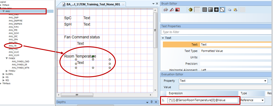 When the graphic template is called from the AHU node, it should display the property Value from the first data point below AHU that has the function Sensor room temperature assigned to it.