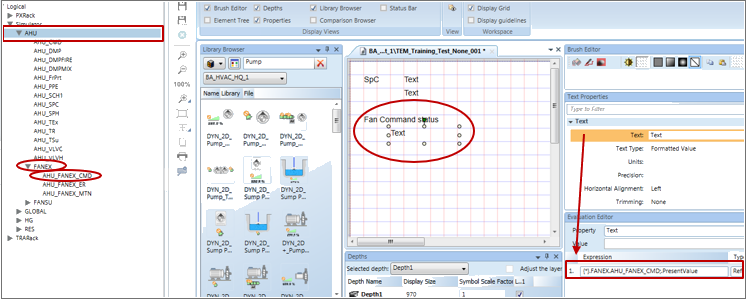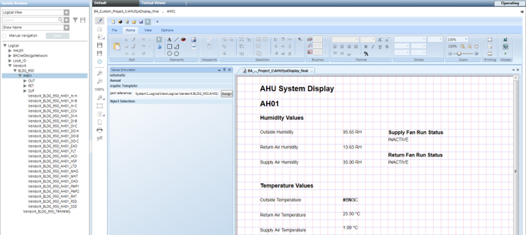 In System Browser, if you click an AHU node the graphic template in the function assigned to AHU displays. The template is configured, in part, with the expression: