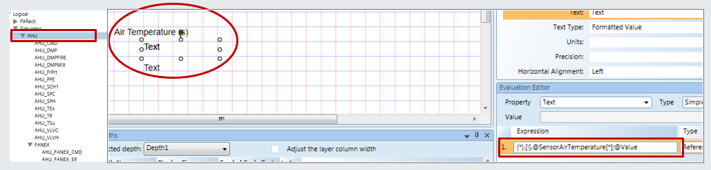 When the template is called from the AHU node, it should display the data for the property ‘Value’ for all data points below AHU that have the function SensorAirTemperature assigned to them.