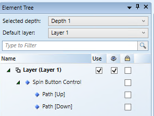 • In the Element Tree, the two UP and DOWN buttons display as children of the Spin button control.