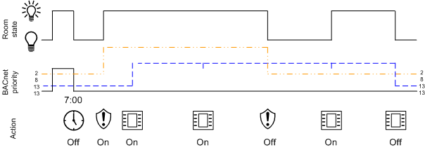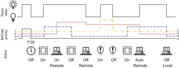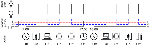 An object is switched at priority 13 with the room operator unit. As a result, light switches, presence detectors, scheduler, or management platform (priority 13) are equal at switching. In other words, the last condition always applies.