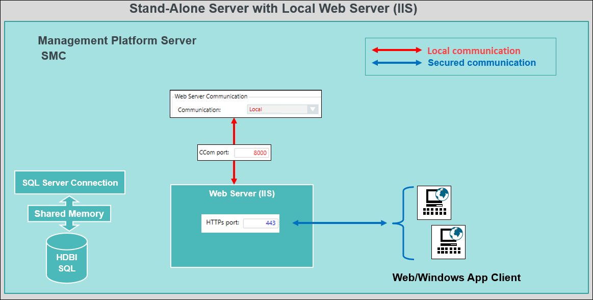 The communication between the Desigo CC Server and the local web server (IIS) can be left as a local communication (without certificates) as they both are hosted on the same stand-alone computer. The communication between the web server (IIS) and Web/Windows App clients is always secured (using the web application certificate).