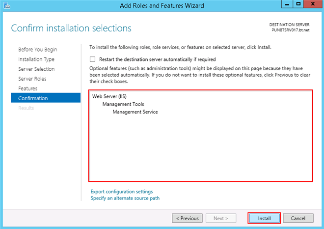 - In the Server Selection > Server Roles, expand Web Server (IIS) and select Management Service under Management Tools.