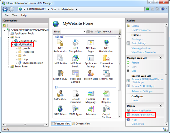 - Select Sites > [website] and click Import Application from the Actions pane.