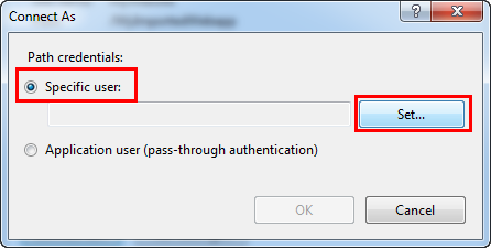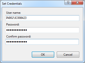 - In the Set Credentials window, enter a user name (domain user credentials with which you have shared the project and virtual directories) and a password and confirm it.