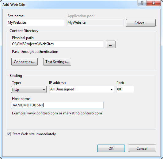 - The web application is created under the website whose host name is the same as the host name of the target machine.