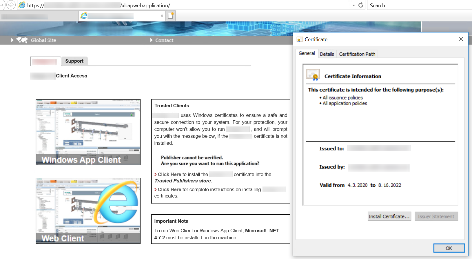 You can launch a Windows App client by browsing the web application link on the local web server (IIS) or on the remote web server (IIS) hosted on a Client/FEP or on remote computer other than web server (IIS). For this you must install the website/web application certificates in the appropriate Windows certificate store.