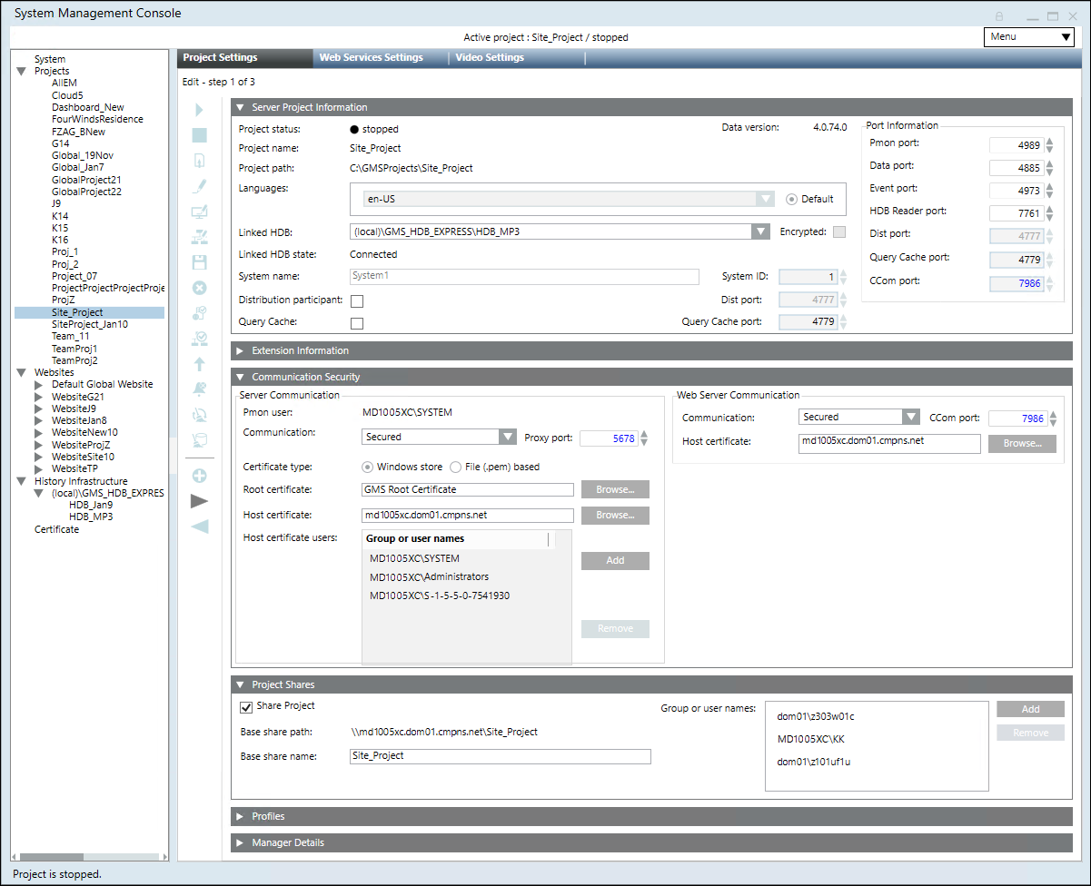— With Web Server communication mode asSecured/Local, the Project Shares expander becomes available in the Project Settings tab.