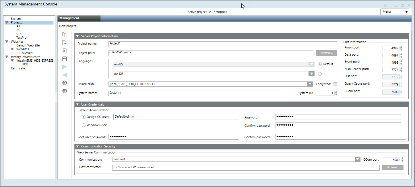- The data entered during project creation, including the history database selected, certificates configured is validated and saved.