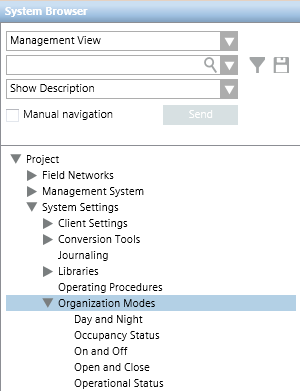 Organization modes are system objects that can reflect the operational status or schedule of the building control site (for example, whether the facility is open or closed, its occupancy status, whether it is day or night, and so on).