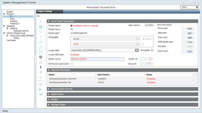 Unknown system(in red) and System ID as0(displays in red) indicates that the restored project has an older data version than the current Desigo CC data version. The system name and system ID of the restored project are displayed on upgrade. - Languages: The language which is not installed but was configured in the project that you restored displays in red. You must install this language pack. Although such a project can run properly, it is still recommended that you install the missing language packs. For all missing languages, the localization files cannot be imported during Add to Project and Upgrade Project workflows. In this case, a warning trace is added to the Smc.log file located at