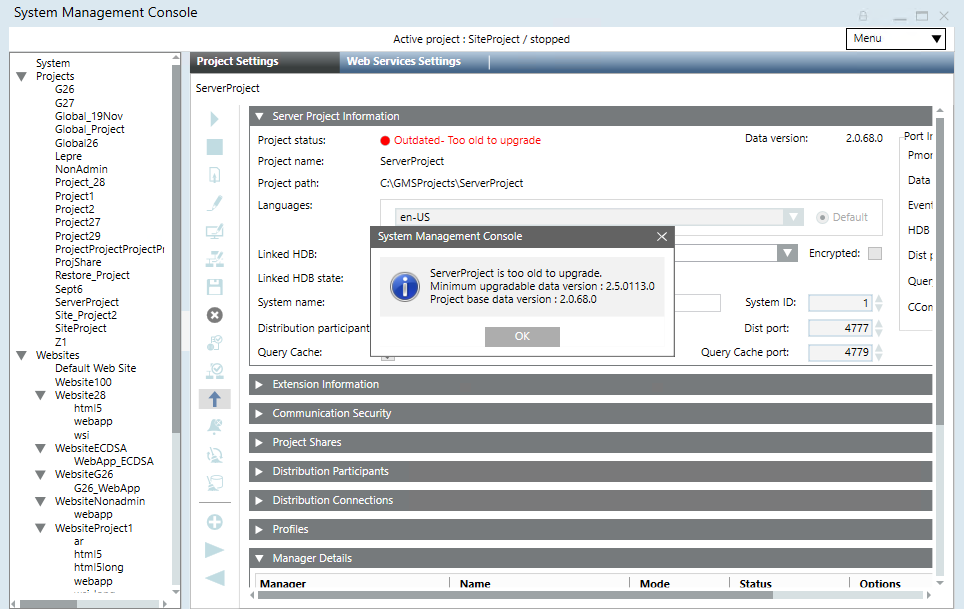 Outdated - Too old to upgrade. When you upgrade such a project, a message informs you accordingly. Currently the default Minimum Upgradable Version is 3.0.
