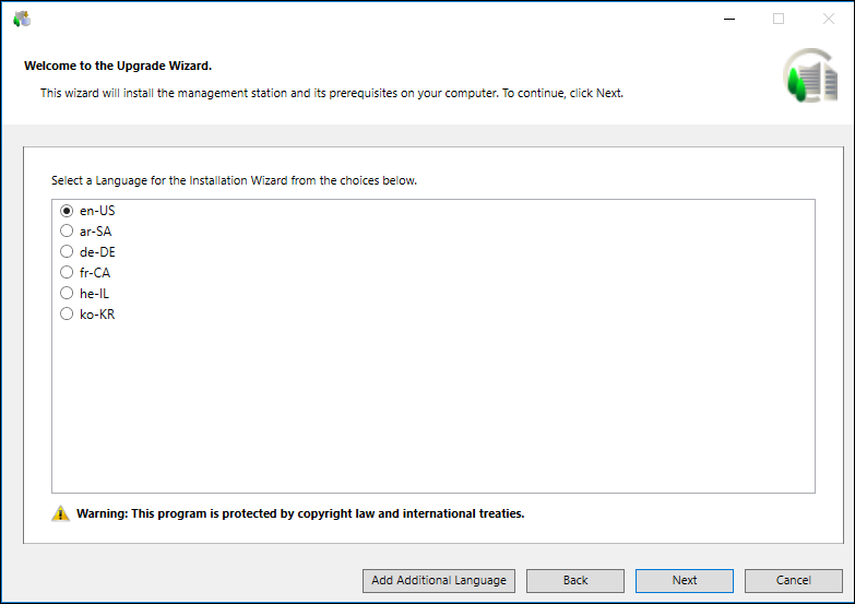 NOTE 2: Regardless of the language selected, the Welcome to the Upgrade Wizard dialog box and all related messages always display in en-US.