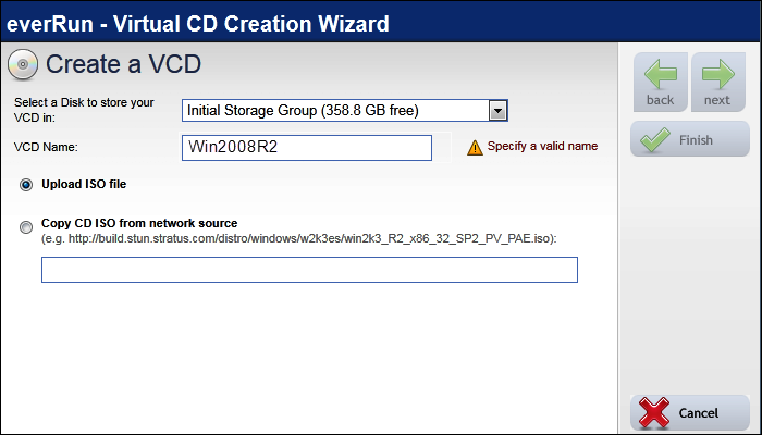 To create a VCD, use the Virtual CD Creation Wizard to copy an ISO file to a storage device on the everRun system. Thereafter, you can boot from it.