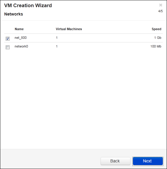 - On the Networks page, select the shared networks to attach to the VM. For more information, see the Planning Virtual Machine Networks section of the everRun’s User’s Guide. Click Next.
