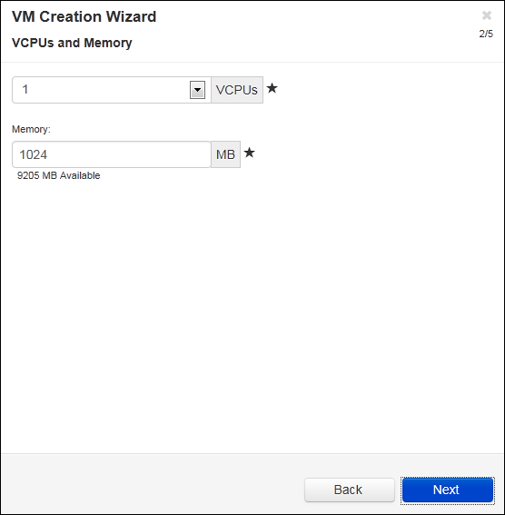 - On the vCPUs and Memory page, enter the number of vCPUs and the amount of Memory to assign to the VM. For more information, see Planning Virtual Machine vCPUs and Planning Virtual Machine Memory. To continue, click Next.