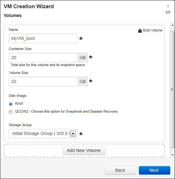 - If applicable, create additional data volumes by clicking Add New Volume and specifying the parameters for each volume. (You can also add volumes after you create the VM by using the Reprovision Virtual Machine wizard, as described in Creating a Volume in a Virtual Machine.)