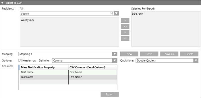 The Export to CSV expander allows the user to configure a CSV mapping and export the recipients to a CSV file.