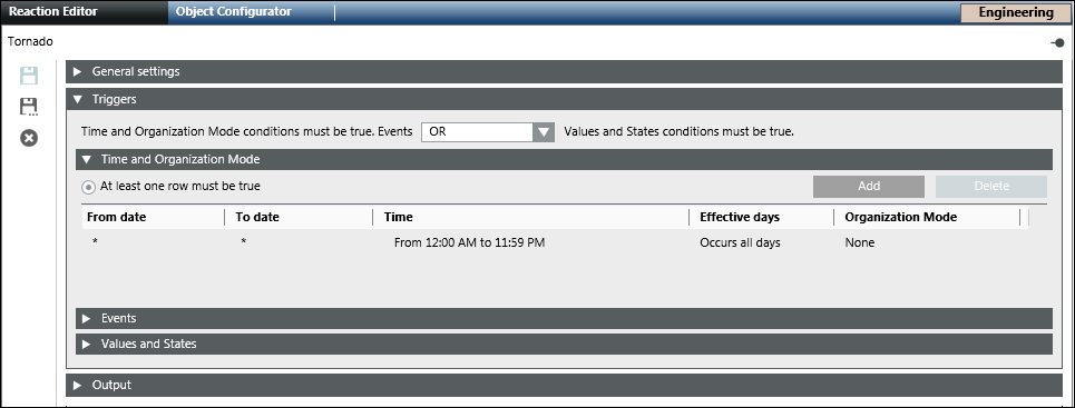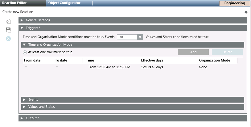 1. In the Triggers expander, specify if the conditions specified in both Events as well as Values and States expanders must be true or if the conditions specified in either of the expanders must be true by selecting the appropriate operator (AND, OR) in the drop-down list.