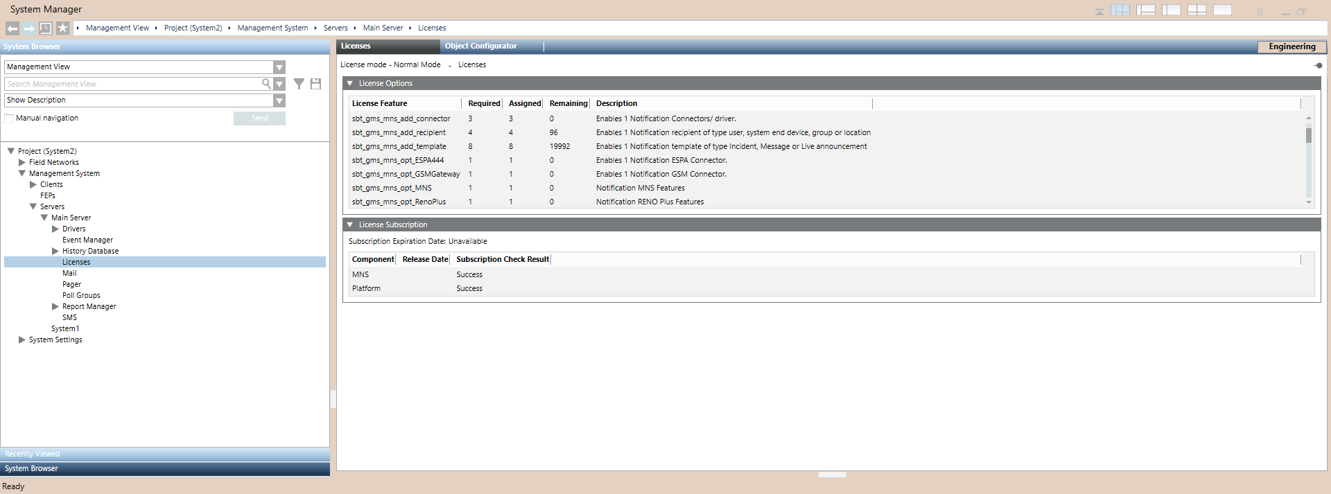 The list of licenses that are activated and that can be activated, can be viewed from Project > Management System > Servers > Main Server > Licenses along with their token information.