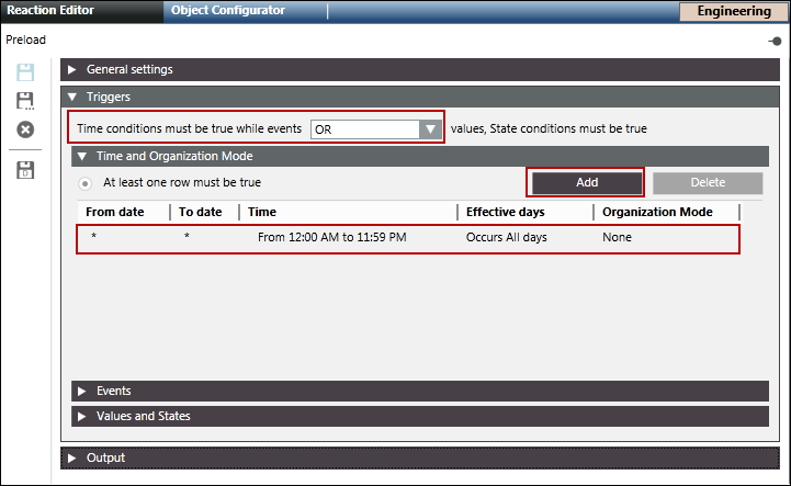 1. Open the Time and Organization Mode expander, click Add to add a new time row and leave all default values, or enter a time or schedule that periodically triggers the Reaction.