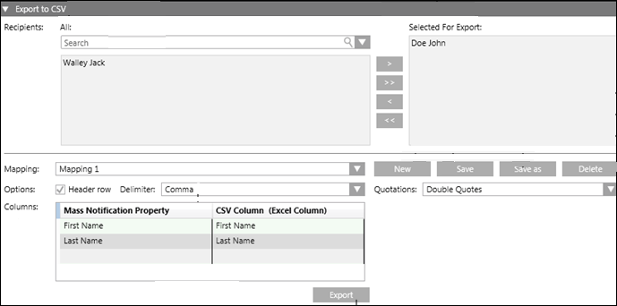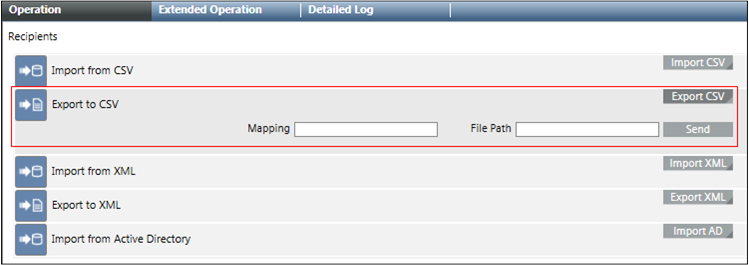 • Export: Starts the recipient user export to a CSV file based on the configured mapping.