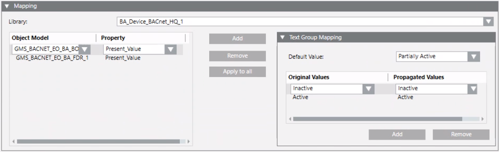 - From the Original Values drop-down list, select the appropriate value for the property whose status information you want to propagate. Then from the Propagated Values drop-down list in the Text Group Mapping expander, select the value on which the Original Values setting will be mapped. This value will be propagated upward. For example, for all the BACnet driver system objects, the value Unknown for the property BBS Status will be mapped and, depending on the propagation rules, propagated upward as Unprocessed.