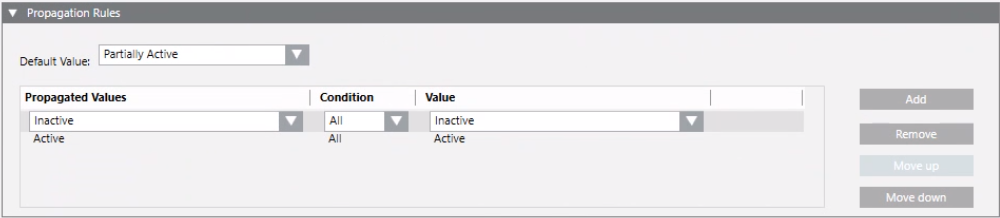 NOTE: If you configure the Object Model only (Functions = n/a), the upward propagation will be stopped when the configured condition is met. If both Object Model and Functions are set, the upward propagation is stopped when both the conditions are met. When a stop condition is matched and the default value is propagated, the associated property will not be visible in the upward levels. If a stop condition is met, and the Default Value is propagated, the corresponding property, which indicates a normal condition, is not displayed in the Operation/Extended Operation tabs and in the Status and Commands window. If a stop condition is met, and a value indicating an off normal condition is propagated, the corresponding property will display in the Operation/Extended Operation tabs and in the Status and Commands window, but the commands will be disabled.