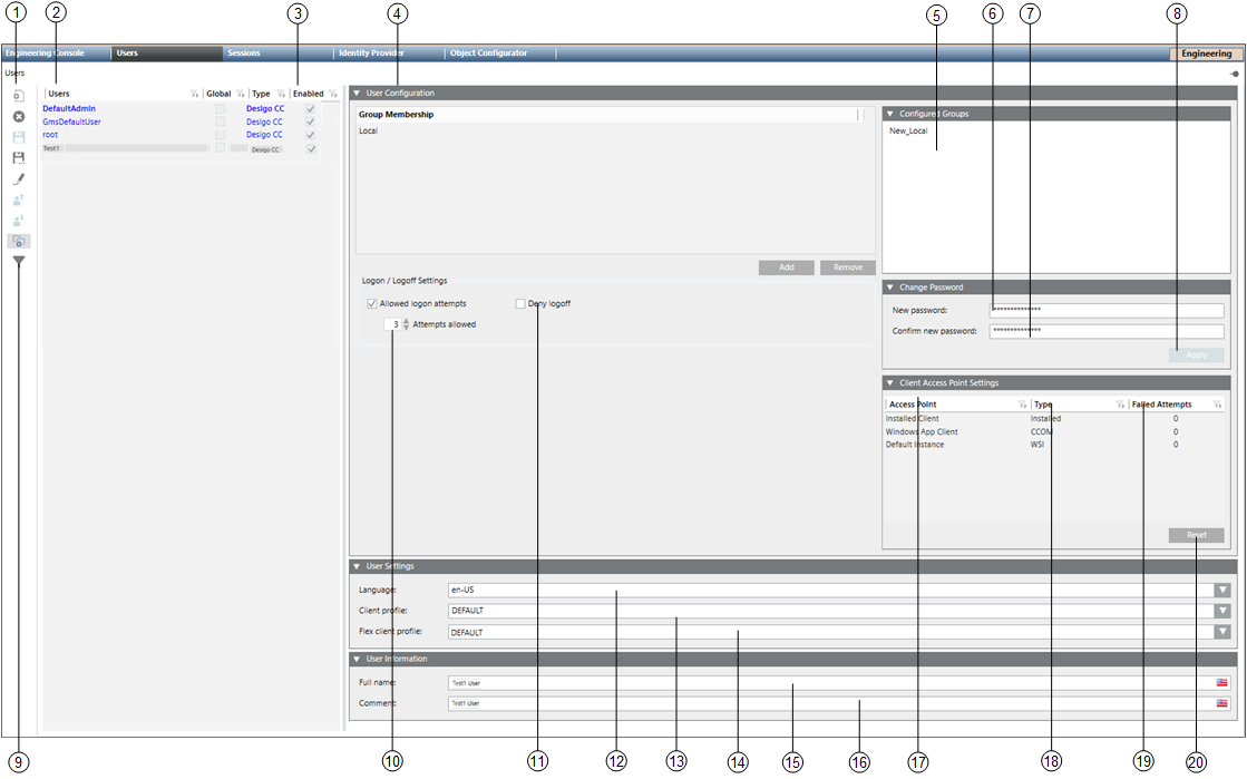 2 | Users | Lists all the defined users with access to Desigo CC. A user name is used to log on to Desigo CC. In a distributed system, the check box in the Global column indicates the type of user. |