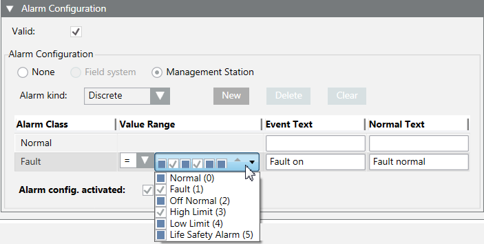 - In the Alarm Configuration expander, select the Valid check box to display activation in grey.