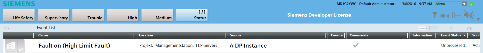 - The alarm is triggered and displayed in the Summary bar under the alarm category State. In the Cause column, the defined alarm text Fault on as well as the two defined conditions in parenthesis (Top limit Fault) are displayed.